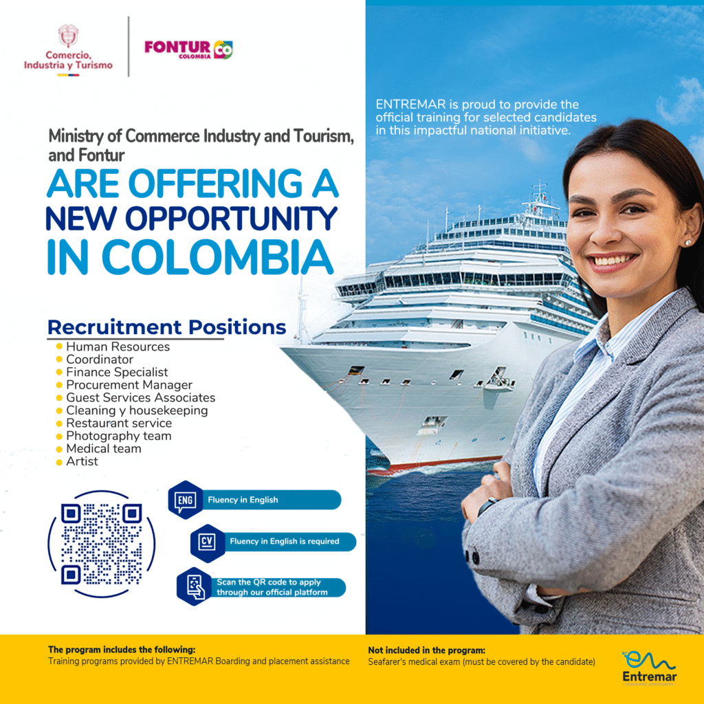 Ministerio de Comercio, Industria y Turismo Fontur y ENTREMAR lanzan una convocatoria dirigida a colombianos que deseen formarse y trabajar en la industria internacional de cruceros.
